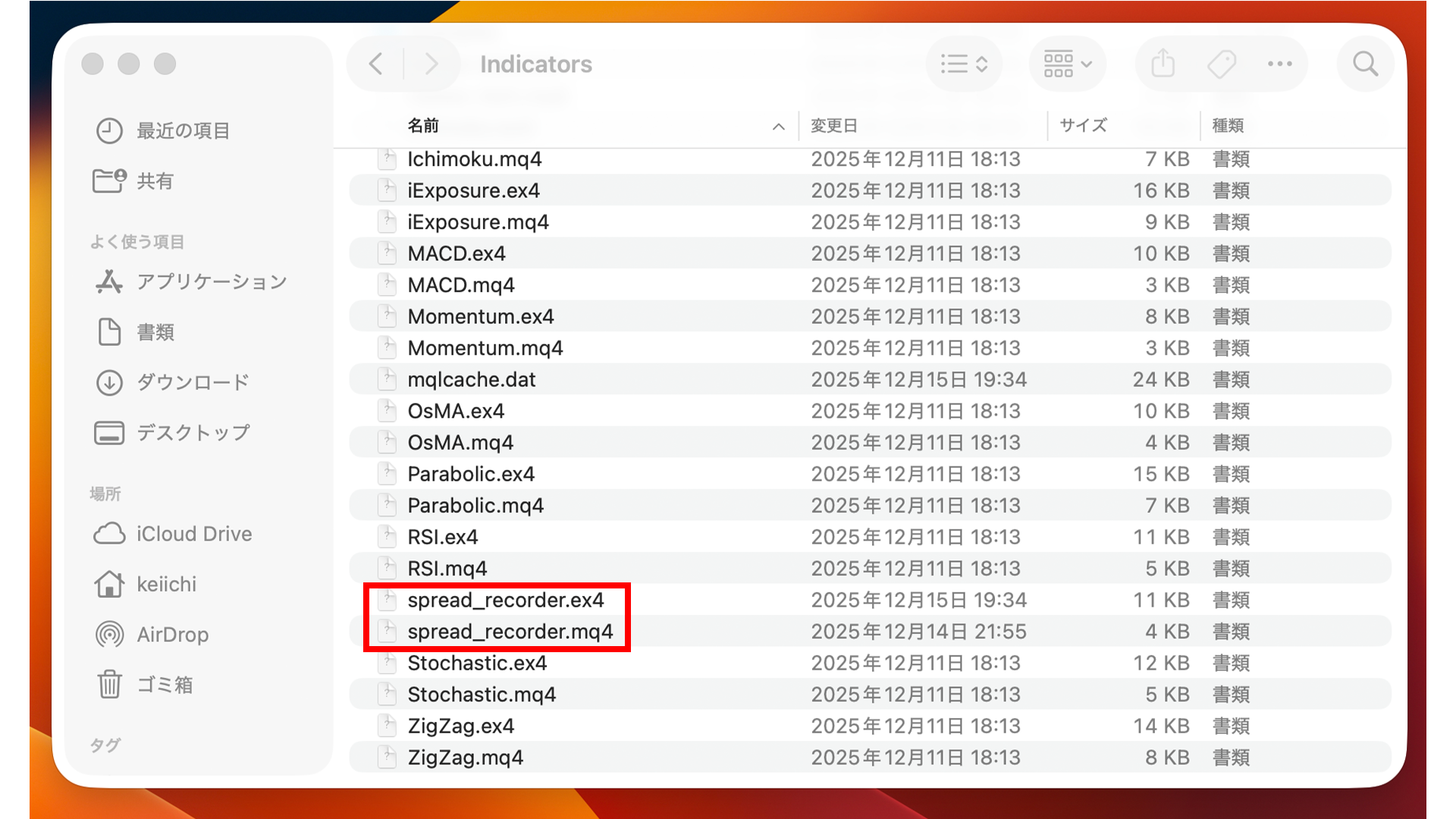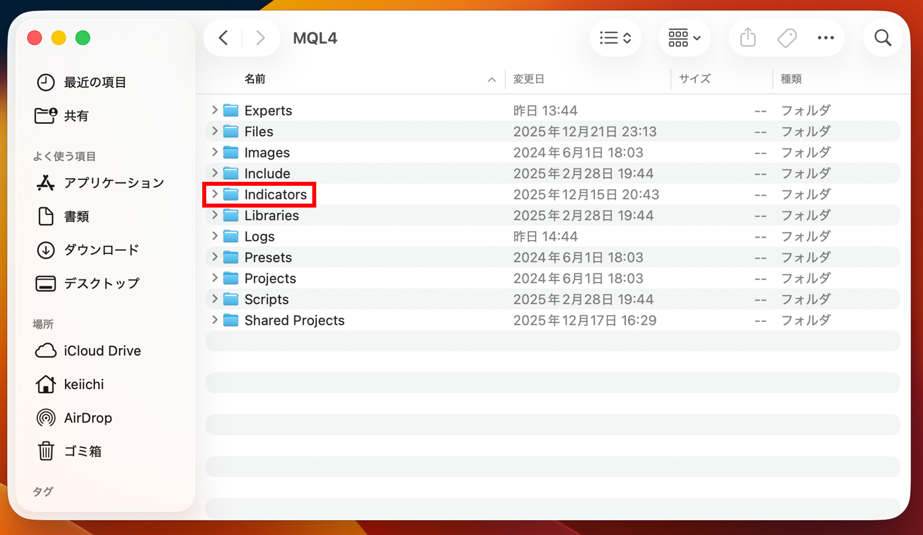 「Indicators」フォルダの中に、カスタムインジケーターが入ったことを確認してください。