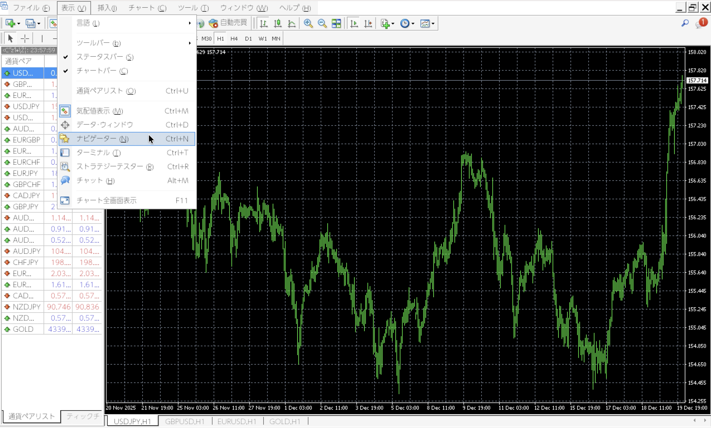 ツールバーの「表示」から「ナビゲーター」を選択します。