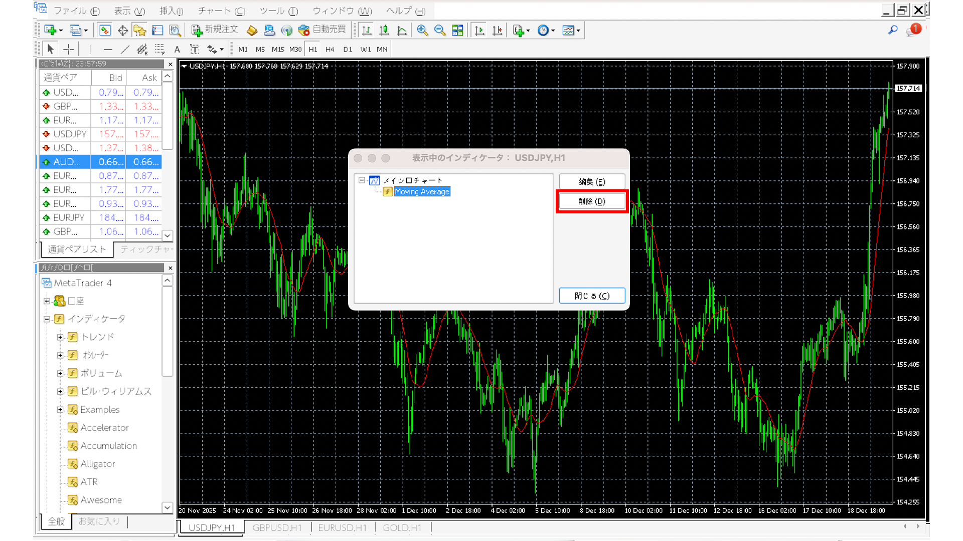 下記のような小画面が表示されるので、削除したいインジケーターを選択した状態で「削除」をクリックします。