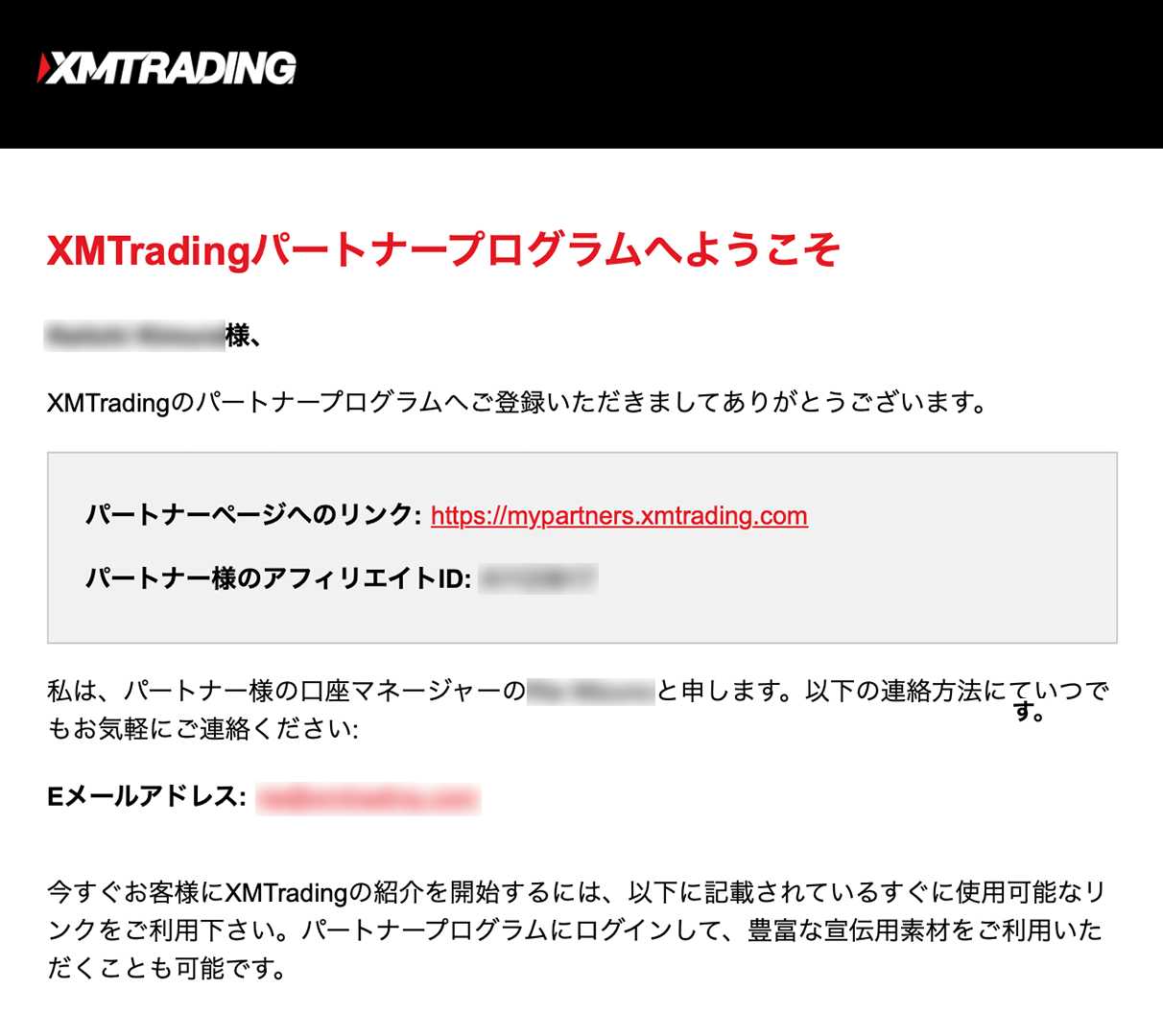 続いて、XMから「XM Tradingパートナープログラムへようこそ」というタイトルのメールが届きます。このメールからXMへアクセスすると、パートナーページにログインできます。
