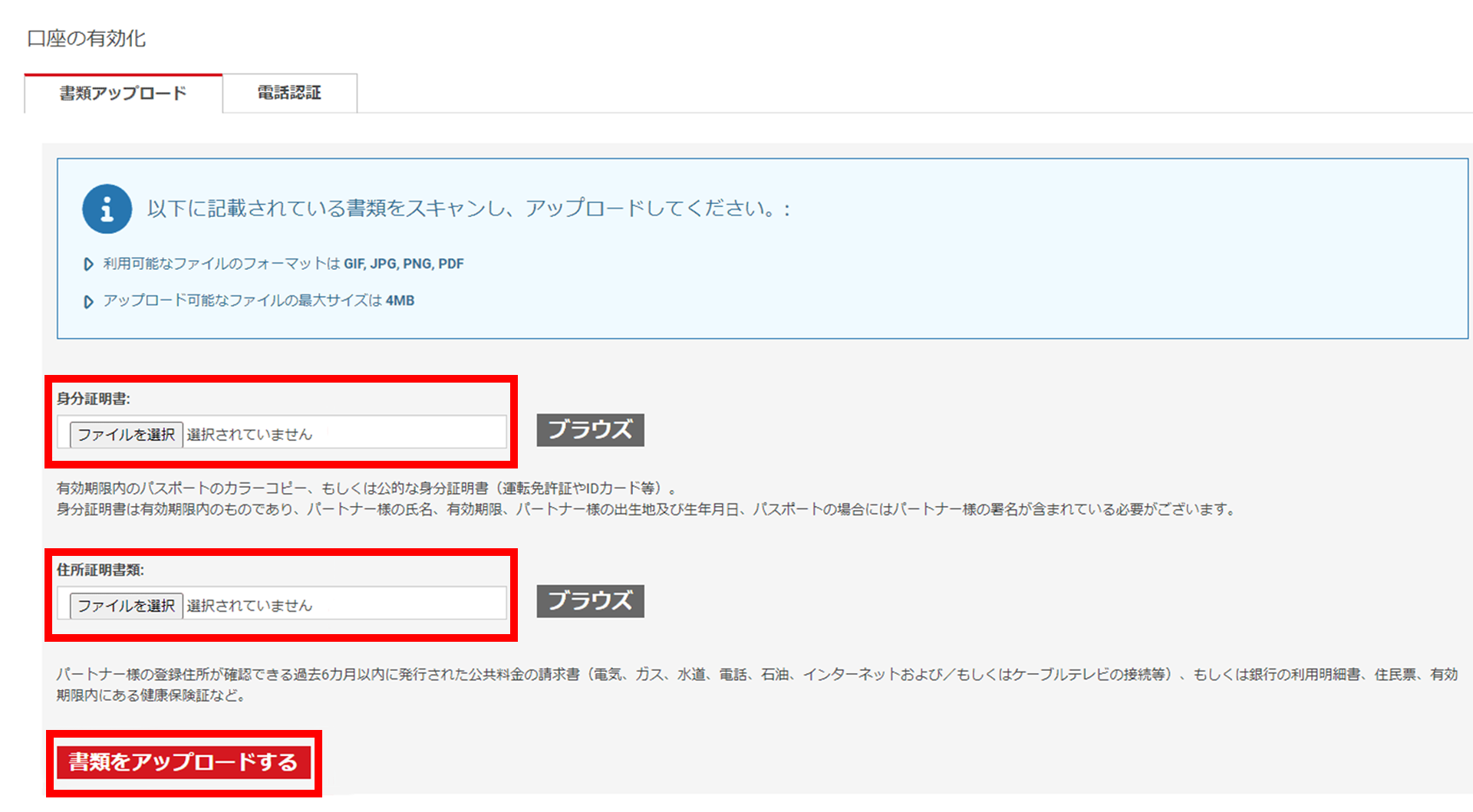 必要書類は、身分証明書と住所証明書類の2種類を提出します。