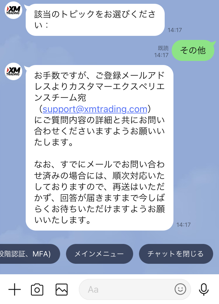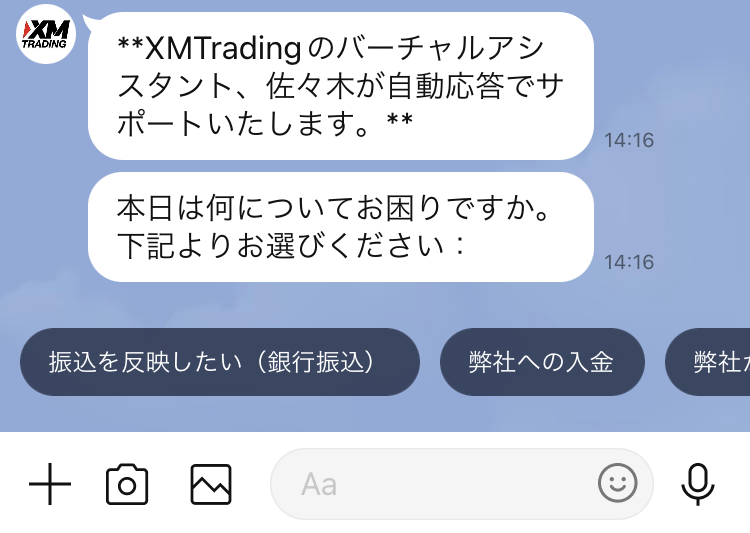 XMのチャット・LINEでの問合せは、すぐに返事が来るのでメールに比べてすごく早いです。